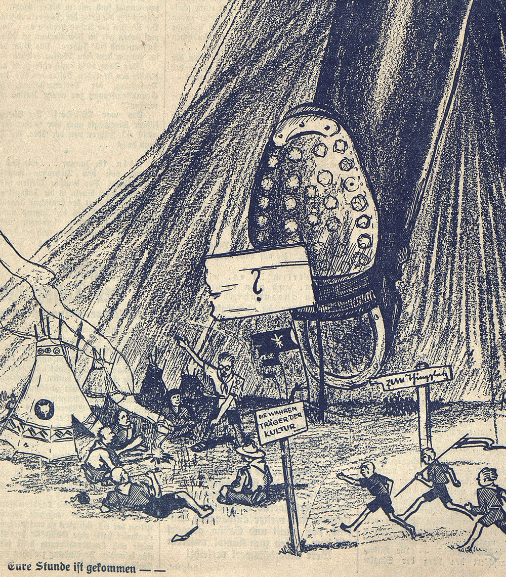 »Eure Stunde ist gekommen…« ist diese Zeichnung im HJ-Blatt »Die Fanfare« im Januar 1934 unterschrieben. Die in der Überschrift des zugehörigen Artikels zum Ausdruck gebrachte Warnung war unmissverständlich: »Glaube keiner, daß die Jugend, die den Namen des Führers trägt, die die Einheit der deutschen Jugend erkämpft hat, sich diese durch krankhaften Ehrgeiz ehemaliger bündischer Führer zerstören läßt.« Die Fanfare, 2. Januar-Ausgabe 1934