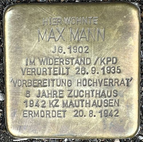 Im Juli 1933 suchte Max Mann erneut Kontakt zur inzwischen illegalen KPD, um sich gegen das NS-Regime zu betätigen, und 1934 wurde er in Widerstandsaktivitäten des Kommunistischen Jugendverbandes eingebunden. Er verteilte illegale Flugschriften, beherbergte einen untergetauchten „Genossen“ und war Anlaufstelle für Funktionäre des KJVD. Nachdem die Geheime Staatspolizei in das illegale Netzwerk des Kölner KJVD eingedrungen war und bereits zahlreiche Personen verhaftet hatte, nahm sie im März 1935 auch Max Mann fest. Im Mai 1935 wurde er von der zuständigen Generalstaatsanwaltschaft in Hamm angeklagt. Der Vorwurf lautete: „Vorbereitung zum Hochverrat“. Das im September 1935 vom Oberlandesgericht in Hamm gesprochene Urteil lautete auf sechs Jahre Zuchthaus. Max Mann verbüßte seine Strafe vermutlich im Zuchthaus Siegburg. Wegen seiner herausgehobenen Rolle im politischen Widerstand und seiner jüdischen Herkunft wurde er danach wohl nicht mehr in Freiheit gelassen, sondern im Anschluss an den Gefängnisaufenthalt in ein Konzentrationslager verschleppt. Anfang August 1942 kam er ins Konzentrationslager Mauthausen, wo er wenige Wochen später zu Tode gebracht wurde.