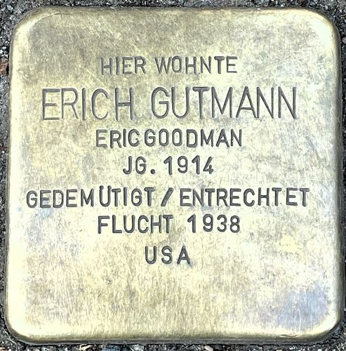 | Biografie | Von der vierköpfigen Familie Gutmann überlebten allein Erich und Helene Gutmann. Ihnen gelang die Flucht in die USA. Die Spur ihrer Eltern Karl und Emma hingegen verliert sich 1944 im Vernichtungslager Auschwitz-Birkenau. Erich Gutmann wurde am 14. April 1914 in Köln geboren und hatte eine jüngere Schwester, Helene. Seine Eltern betrieben in der Verloer Straße 25 ein Delikatessengeschäft. Nach der Machtüberbnahme der Nationalsozialisten verloren sie einen Großteil ihrer Kundschaft. Erich Gutmann floh im September 1938 in die USA, wo er die Kölnerin Friedel Eizenberg heiratete und mit ihr zwei Kinder bekam. Die Familie ließ sich in Kalifornien nieder, und Erich Gutmann betrieb viele Jahre eine Bäckerei in Berkeley. Er starb am 2. Dezember 1993. |