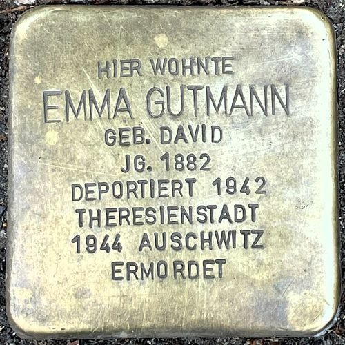 Vermutlich 1941 mussten Karl und Emma Gutmann ihre Wohnung in der Venloer Straße räumen und wurden gezwungen, in ein Ghettohaus am Horst-Wessel-Platz 14, dem heutigen Rathenauplatz, zu ziehen. Am 27. Juni 1942 wurden sie in das Ghetto Theresienstadt deportiert, wo sie mehr als zwei Jahre unter menschenunwürdigen Umständen lebten. Am 16. Oktober 1944 transportierte man sie in das Vernichtungslager Auschwitz-Birkenau. Vermutlich wurden sie dort wenig später ermordet. |