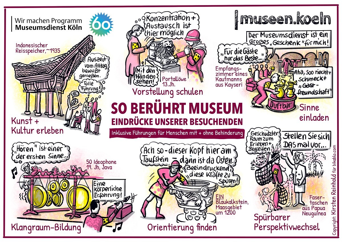 Ergänzend entstanden im Jubiläumsjahr in Zusammenarbeit mit Kirsten Reinhold zwei Graphic Recordings als visuelle Protokolle der „Woche des Sehens“. Sie geben einen besonderen Einblick in die vielfältigen Möglichkeiten, die der Museumsdienst Köln regelmäßig nutzt, um Kultur für alle erlebbar zu machen.