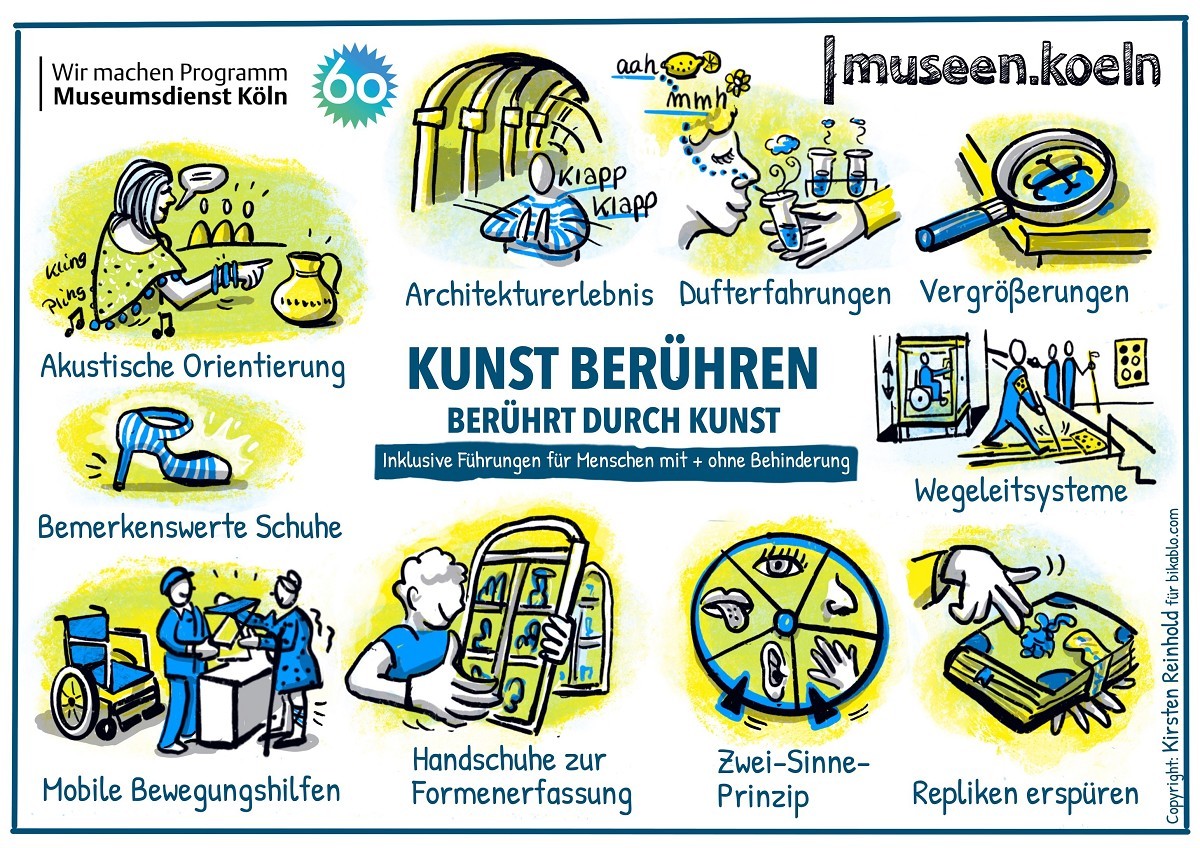 Die Klein-Grafiken zeigen die Vielfalt an Methoden und Hilfsmitteln, die bei inklusiven Führungen zum Einsatz kommen und Tast-, Hör- und Geruchssinn ansprechen.