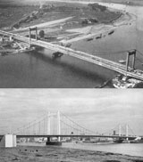 Am 20. Juni 1927 schlug das letzte Stündlein für die Mülheimer Schiffbrücke, die hier auf einer Aufnahme von August Sander aus dem Jahr 1925 zu sehen ist. Festlich geschmückt und unter reger Anteilnahme der Bevölkerung wurde sie abgefahren. Sie mußte Platz machen für die neue, feste Brücke. Die Schiffbrücke selbst, die 1885 ausrangierte Mainzer Schiffbrücke, war erst 1888 an dieser Stelle in Betrieb genommen worden. Bis dahin wurde der Fährverkehr zwischen Köln und Mülheim mit Booten – dem „Müllemer Bötche“ – und Fähren betrieben. Bei den Verhandlung zur Eingemeindung von Mülheim nach Köln (zum 1. April 1914) hatte man sich auf eine feste Brücke geeinigt, aber der folgende Weltkrieg setzte andere Prioritäten. In den 1920er Jahren wurden die Verkehrsverhältnisse jedoch immer kritischer, nicht zuletzt durch den steigenden Verkehr an Motorfahrzeugen. 1925 mußte die Schiffbrücke 31-mal am Tag geöffnet werden, bei einer durchschnittlichen Öffnung von 9 Minuten hieß das, die Brücke war zum Verkehrshindernis geworden. Zudem wich der Verkehr auf die beiden Altstadtbrücken aus. So beschloß die Kölner Stadtverordnetenversammlung im Juli 1926 den Bau einer festen Rheinbrücke zwischen Köln und Mülheim. Man rechnete mit Gesamtkosten von 22 Mio RM. Es wurde – wie üblich – ein Wettbewerb ausgeschrieben und im Februar 1927 enschied sich das Preisgericht für die Bogenbrücke der Fa. Krupp. Oberbürgermeister Konrad Adenauer aber gefiel diese Brücke überhaupt nicht, er plädierte aus ästhetischen Gründen für eine Hängebrücke. Es folgten weitere Entwürfe und Verhandlungen, Vertagungen und Gutachten und schließlich tendierte die Meinung der Stadtverordneten zu einer Hängebrücke, wie sie von einer Anbietergemeinschaft – darunter die Kölner Unternehmen Felten & Guilleaume und Grün & Bilfinger – zum Preis von 13,3 Mio RM vorgestellt wurde. Neben dem ästhetischen Aspekt war auch von Bedeutung, daß bei diesem Bau 58 Prozent der ausgegebenen Gelder in Köln verblieben. Krupp legte ein neues Angebot mit 9,95 Mio RM für eine Bogenbrücke vor. Daraufhin wurden neue Angebote für eine Hängebrücke eingefordert und schließlich votierten die Abgeordneten mit einer Mehrheit aus Zentrum und Kommunisten mit 47 : 36 für eine Hängebrücke zum Preis von 11,09 Mio RM. Die tatsächlichen Kosten (incl. Grundstückserwerb usw.) beliefen sich am Ende auf 16,9 Mio RM. Die 1927 bis 1929 errichtete Mülheimer Brücke war die erste Brücke (s. kleines Bild rechts), die den Rhein in einer Öffnung überspannte. Die Weite von Pfeiler zu Pfeiler betrug 315 Meter sowie 91 Meter Nebenöffnung auf jeder Seite. Die Gesamtstützweite betrug 497,06 Meter. Diese größte Hängebrücke Europas wurde vor 75 Jahren am 13. Oktober 1929 feierlich in Betrieb genommen. Sie hatte aber nur 15 Jahre Bestand: Am 14. Oktober 1944 wurde sie als erste Kölner Rheinbrücke bei einem Luftangriff zerstört. Schon bald nach Kriegsende stand fest, daß die Mülheimer Brücke wieder errichtet werden sollte. Im September 1949 entschied sich die Kölner Stadtverordnetenvertretung für eine erdverankerte Hängebrücke (angeboten von Kölner Firmen). Nicht zufällig begannen am 13. Oktober 1949 die Bauarbeiten, am 8. September 1951 folgte die feierliche Einweihung, an der auch Bundeskanzler Adenauer teilnahm.
