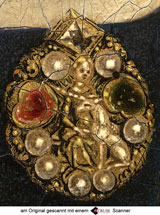 In Tagespresse, Funk und Fernsehen machte in den vergangenen Wochen das Wort vom Lochner-Code die Runde. In einer kleinen Serie zeigt das „Bild der Woche“, welche geheimen Botschaften der berühmteste spätmittelalterliche Kölner Maler in seinem weltbekannten Madonnenbild versteckt hatte. In dieser ersten Folge geht es um die Bildthematik Seit je gilt die „Muttergottes in der Rosenlaube“ als eine besonders innige und liebliche Darstellung. Dem heutigen, von täglichen Nachrichtenbildern und permanenten Tabubrüchen in allen Medien abgehärteten Blick mag diese Lieblichkeit zunächst schlicht als Kitsch erscheinen. Kitsch jedoch beinhaltet grundsätzlich eine wie auch immer geartete Lüge. Lochners Gemälde ist hingegen von einer tief empfundenen Glaubensgewissheit durchdrungen. In einer Zeit, da Zucker noch ein Luxusgut war, stellte Süßigkeit einen eigenen, hohen Wert dar – in der Theologie wie in der Kunst. Zu den einst vor diesem Bild gemurmelten Gebeten mag durchaus das „Salve Regina“ gehört habe, das Maria ausdrücklich als „unsere Süßigkeit und Hoffnung“ bezeichnet. Die Krone der „Regina“, der Himmelskönigin Maria befindet sich in der Mittelachse des Bildes, unterhalb einer Darstellung des ebenfalls gekrönten Gottvater. Bindeglied zwischen den beiden Figuren ist die Taube des Heiligen Geistes, die sich vom Himmel aus auf den Weg zu Maria macht. In Darstellungen der Verkündigung zeigt dieser Taubenflug die Menschwerdung Gottes im Leib der Jungfrau Maria an. Daß es auch in unserem Bild um diese Thematik geht, hat der Künstler an ebenso zentraler wie versteckter Stelle deutlich gemacht: Die nur 1½ Zentimeter große Brosche Mariens (s. Bild rechts) zeigt eine Jungfrau mit dem Einhorn im Schoß – eine im Mittelalter gebräuchliche symbolische Darstellung der Inkarnation (Menschwerdung) Christi in Maria. Bislang unbeachtet blieb die Gestik von Jungfrau und Einhorn: Das Mädchen legt seine rechte Hand auf den rechten Vorderlauf des Fabelwesens. Die gleiche Gestik zeigt Lochners Gemälde auch im Großen, denn Maria und der Jesusknabe sind ebenfalls mit der jeweils rechten Hand verbunden. In den Augen des zeitgenössischen Betrachters hatte diese Gestik geradezu juristische Bedeutung, denn die jeweils rechte Hand gaben sich die Brautleute bei der Vermählung. In Lochners Gemälde ist die sogenannte „Mystische Vermählung“ zwischen Christus und Maria dargestellt, wobei die Gottesmutter hier zugleich die Rolle der „Ecclesia“, der Kirche, übernimmt. Eine wichtige Vorausdeutung auf die mystische Hochzeit zwischen Jesus und seiner Kirche sieht die christliche Bibelauslegung im Hohenlied des Alten Testamentes, einem wundervollen, ungemein bildreichen Brautgesang. s. hierzu auch: Bdw 51/1998