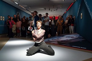 Eine Führung, die auch eine Performance ist – eine Tänzerin bewegt sich durch die Ausstellung „It’s me! – Selbstinszenierung im Tanz” und stellt über die Bewegung Beziehungen zwischen Körper, Exponaten und der Ausstellungsarchitektur her.