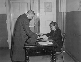 Abb: Abgabe des Entnazifizierungs-Fragebogen in Berlin-Steglitz, 1946 © U.S. Army Signal Corps, National Archives in Washington D.C.,