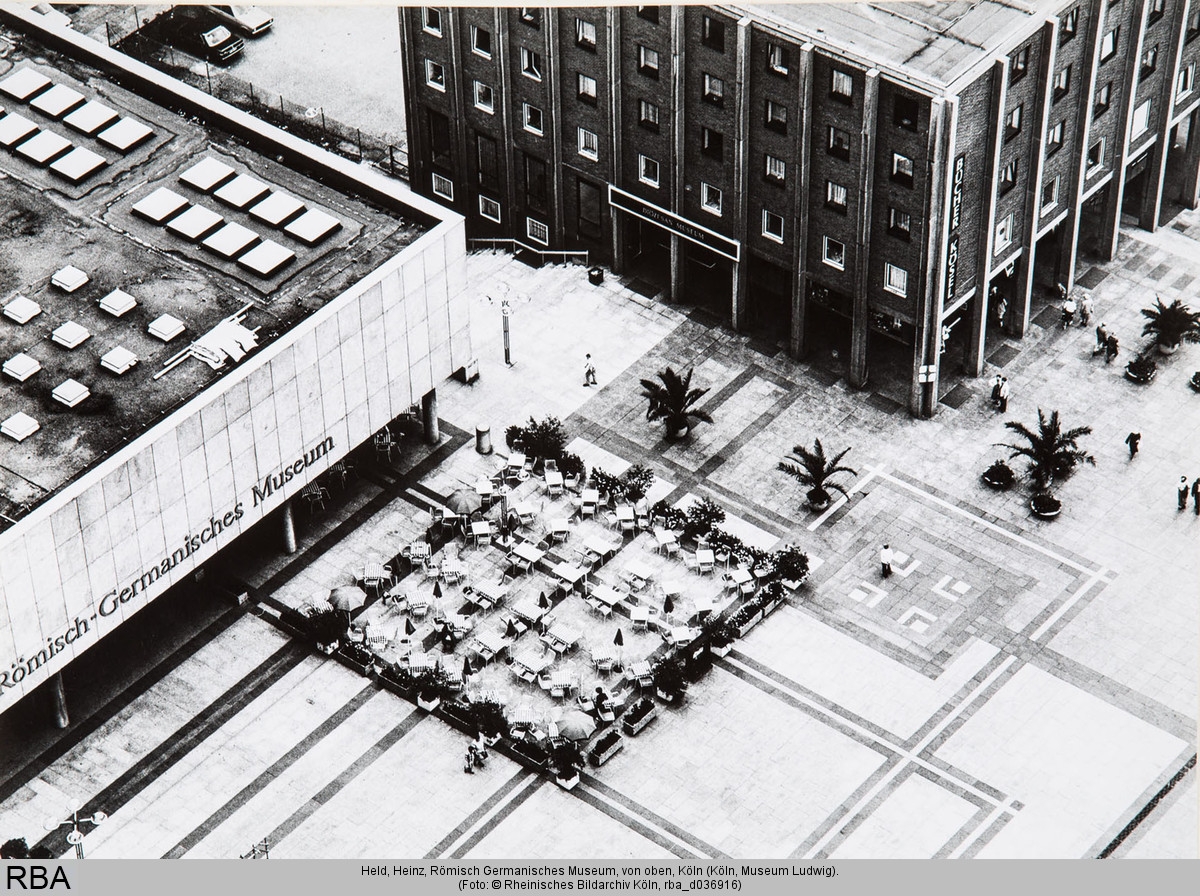 Unser Bild der Woche zeigt die Situation, wie sie sich Anfang der 1970er Jahre zeigte. Der Fotograf Heinz Held hatte diese wohlausgewogene Aufnahme vom Dach des Hohen Doms gemacht, der den Platz nach Norden begrenzt. Im Bild sieht man links das Römisch-Germanische Museum, oben das Kurienhaus und in der Mitte die Terrasse des einstigen Museumscafés, an das sich nur noch die älteren Kölnerinnen und Kölner erinnern dürften.