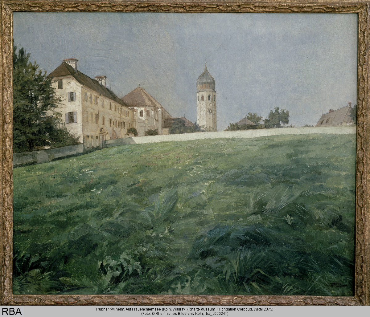 Der Gruppe der Chiemseemaler gehört auch Wilhelm Trübner an. Der deutsche Künstler ließ sich auf der ruhigen idyllischen Insel für seine Landschaftsgemälde inspirieren. Das Bild „Auf Frauenchiemsee“ ist eines der Werke seiner Zeit auf der Insel. Es gewährt den Blick auf eine beschauliche Landschaft und stille Natur. Im Gegensatz zu dem heutigen belebten Touristenziel, stellt er in seinem Bild die Harmonie in den Mittelpunkt; die grüne Natur steht im Einklang mit der Klosteranlage. Auf diese Weise schafft er eine romantische Blickweise auf die Fraueninsel im Kontrast zum alltäglichen Besucheransturm. Den gab es allerdings schon damals, und mit der Ankunft der Künstler setzte auch der Fremdenverkehgr ein. Die Eisenbahn brachte die Besucher binnen kurzer Zeit aus München nach Prien am Chiemsee, und von dort ging es mit dem Dampfschiff hinüber zur Fraueninsel, vor allem an den Wochenenden. Trübners Idylle dürfte eine Fiktion sein.