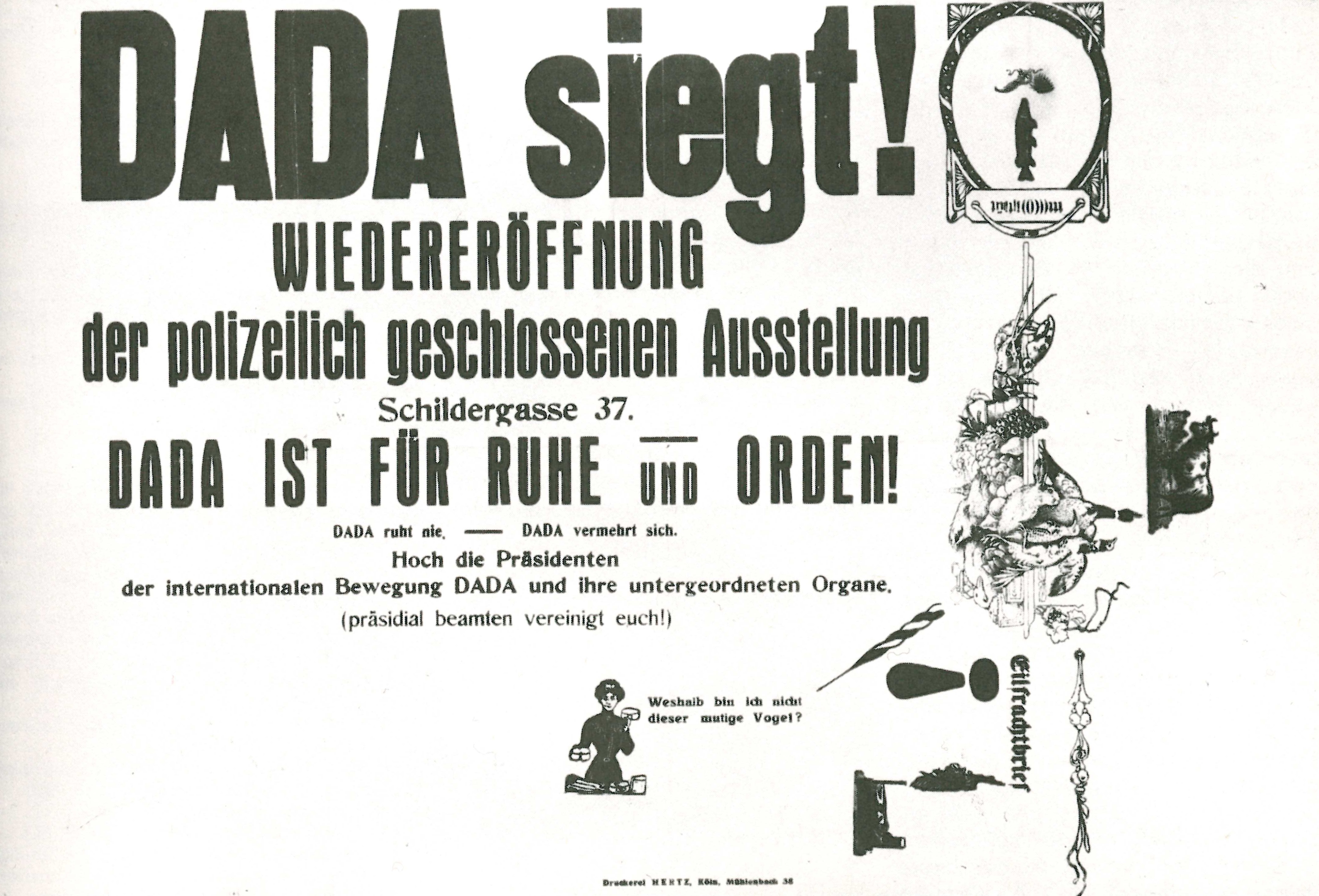 Der Museumsdirektor ließ die Arbeiten von Dadamax Ernst und Johannes T. Baargeld (d. i. Alfred Gruenwald) aus der Ausstellung entfernen. Die beiden mieteten daraufhin den Lichthof des Brauhauses Winter in der Schildergasse 37. Ein Beil in der Ausstellung sollte es Besucher*innen ermöglichen, alles, was ihnen nicht gefiele, zu zerstören.